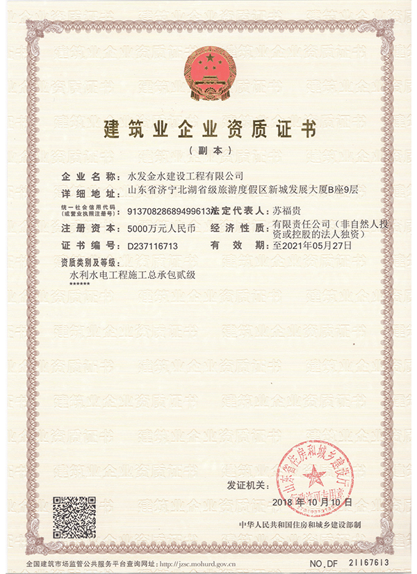 水發金水建設工程有限公司 水利水電資質證書