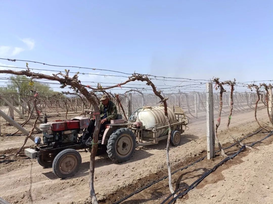 雙河水發北疆果蔬公司五師雙河市葡萄產業現代農業示范區的技術員仍然戰斗在生產一線,為了確保180畝流轉葡萄地的苗木出土后的正常生長,按照公司制定綠色葡萄生產標準化管理規程相關要求,公司羅平、何興華等生產技術人員在調配農藥殺菌劑,采用機械化的霧化噴施,對已出土的葡萄苗木開展病蟲害集中消殺清理。