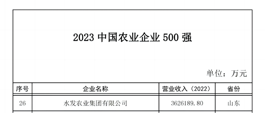 12月20日,“2023年中國農業企業500強”榜單正式發布。水發農業集團位列第26位,較去年提升11位。